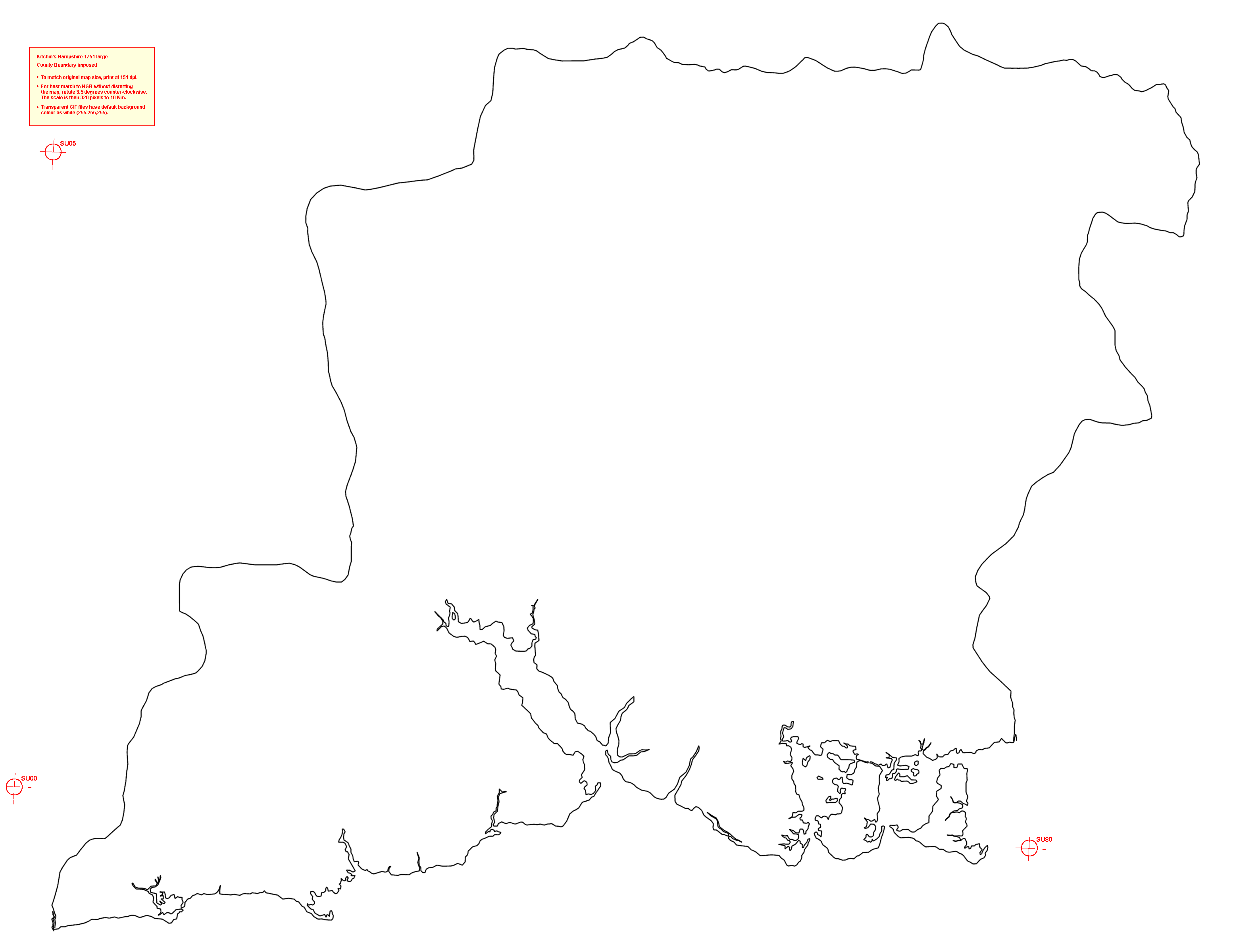 Imposed county boundary. (The saveable image file is much bigger and clearer than shown here.) ![]() Kit2BdyA.gif Right click the image: "save image/picture" will save the large version. Registration marks at:- SU00, SU05, SU80 Part width SU00-SU80 = 430 mm Part height SU00-SU05 = 269 mm Grid 3.5 degrees clockwise. |