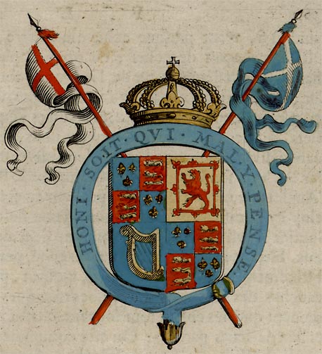 coat of arms of Charles I of England and Scotland, and motto:-