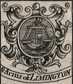 a one masted ship, sail furled, hanging from the rigging a shield charged with three roundels and a label.