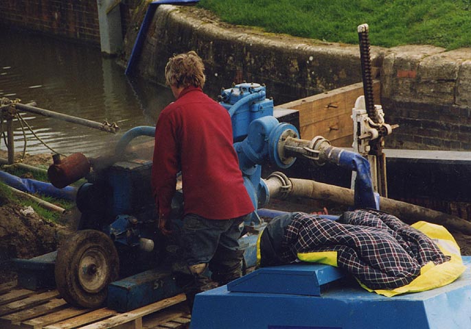 A navvy working the pump keeping the lock empty during repair, the water from above held back by a stank.