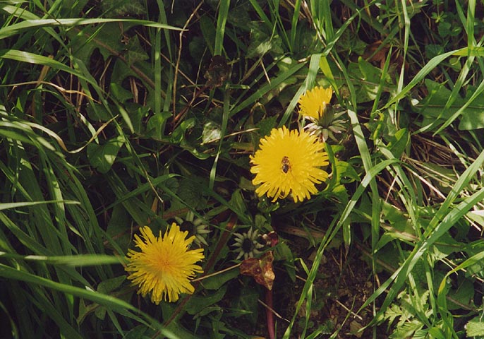 Dandelions, Taraxacum officinale, and a bee, in the bank of the towpath. -- SU09126171