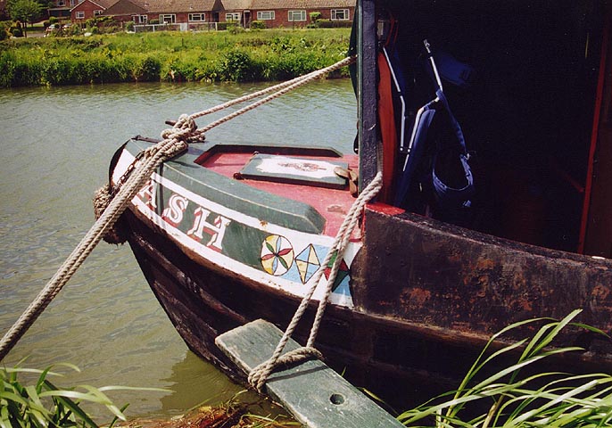 Boat Ash moored eastward of Great Bedwyn; neat hitches and a neatly hitched gangplank.
