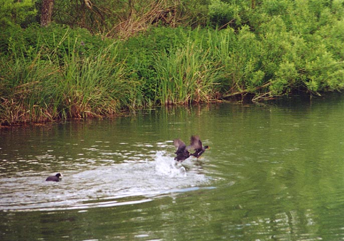 Coot, Fulica atra, bullying a moorhen, Gallinula chloropus. After