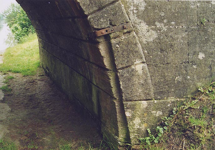 There was once an iron rubbing strip to take the wear of tow ropes, having gone there is some signs of wear on the stone.