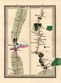 Strip map, road map, part of route London to Southampton, Hampshire, scale