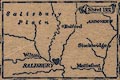 -- black and red on cream; 'antique style' location map; coat of arms; picture